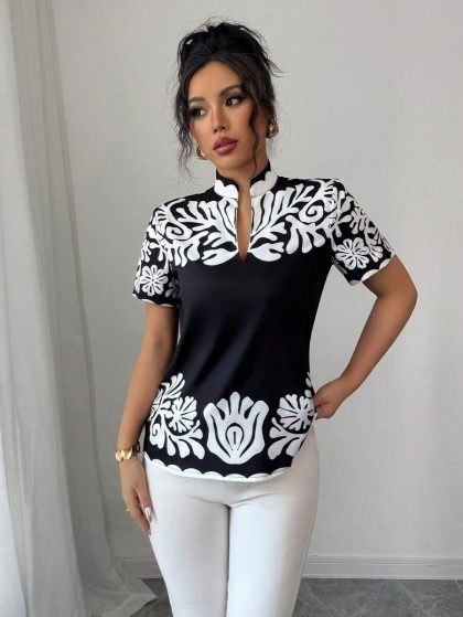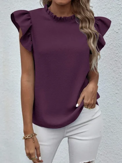 Breezaya Solid Color Ruffle Collar Short Sleeve Elegant Blouse
