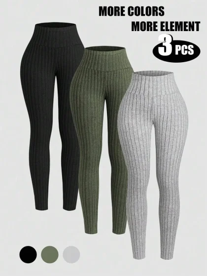 Rina Fox 3pcs/Set Women’s Solid Color Ribbed Leggings Fall Cloth For Women