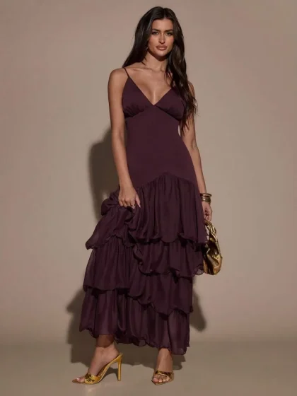 SHEIN BAE Women’s Elegant Solid-Color Party Dress with Ruffle Hem and Spaghetti Straps