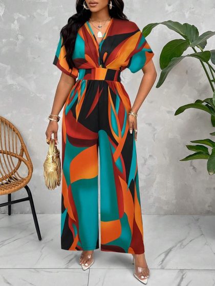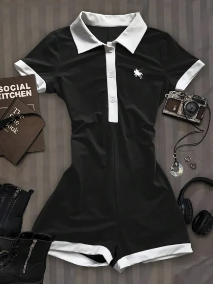 Attitoon Women’s Polo Neck Graphic Jumpsuit – Casual & Vintage College Style