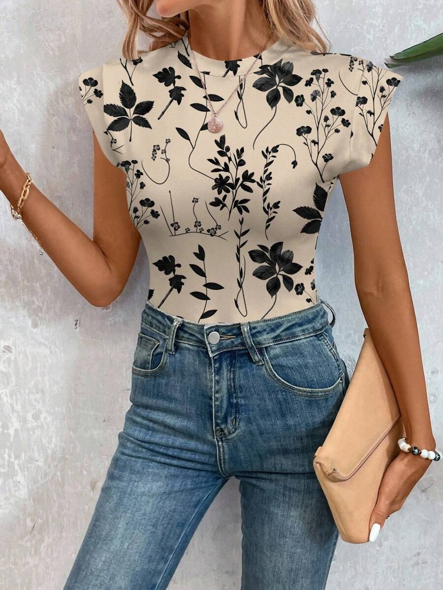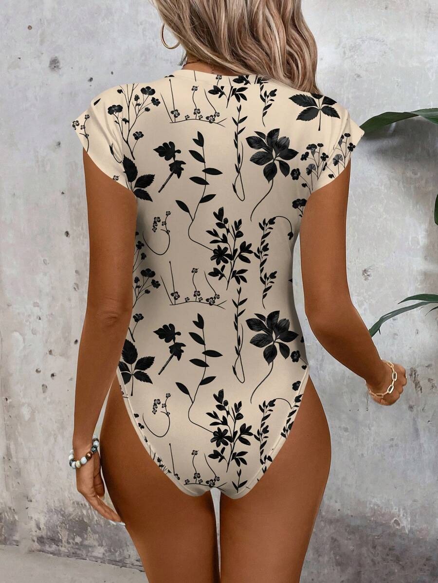 EMERY ROSE Khaki Floral & Leaf Print Short Sleeve Bodysuit