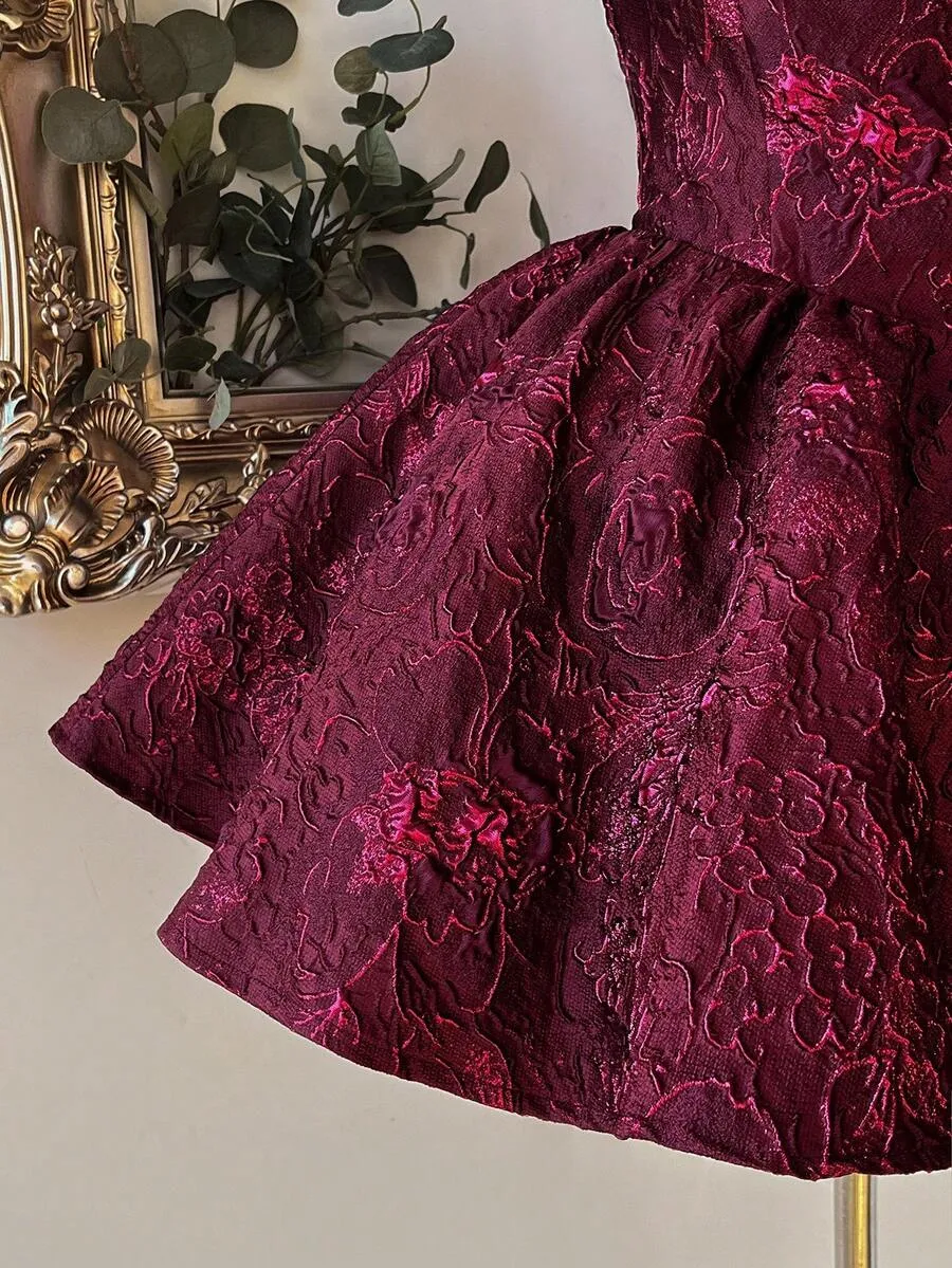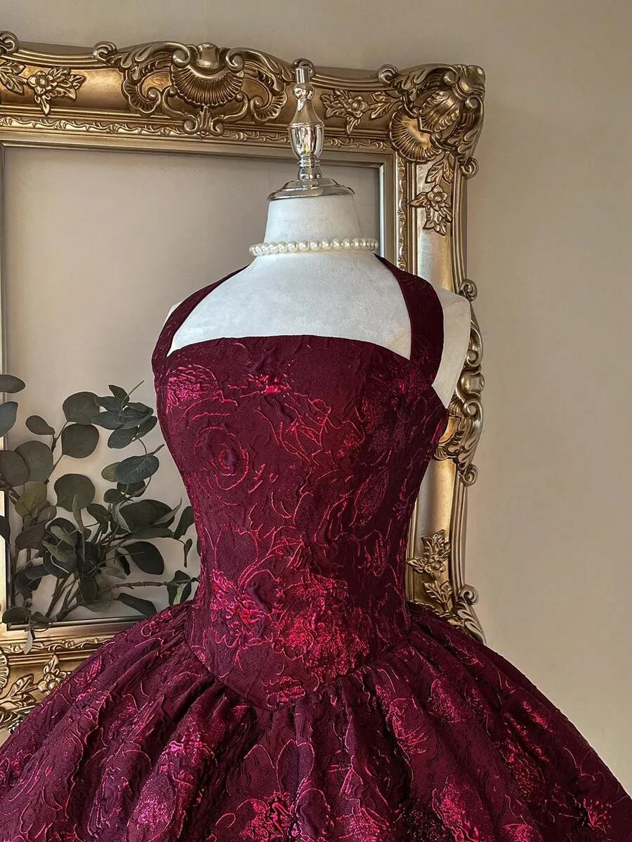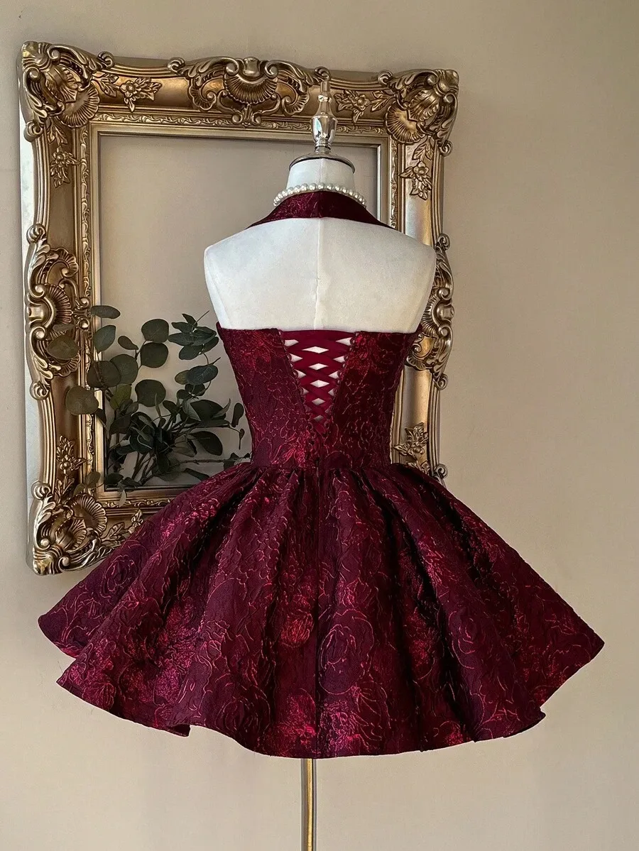 Lovelzi Burgundy Jacquard Halter Backless A-Line Dress