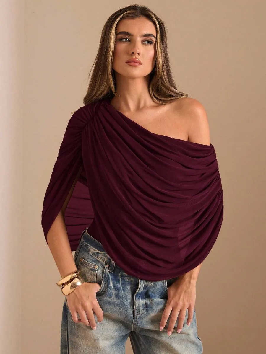 SHEIN BAE Brown Off-Shoulder Ruched Fitted Bodysuit