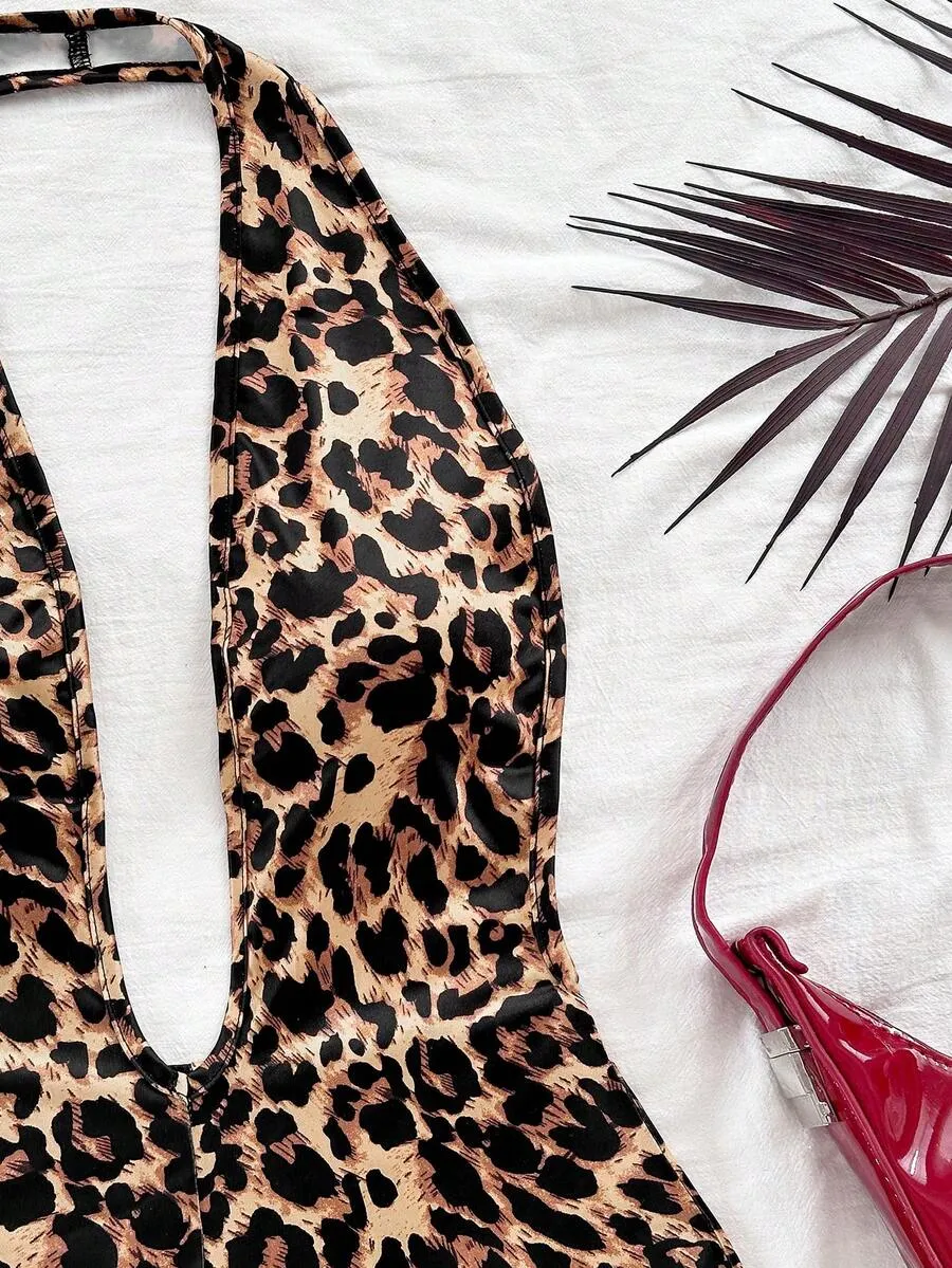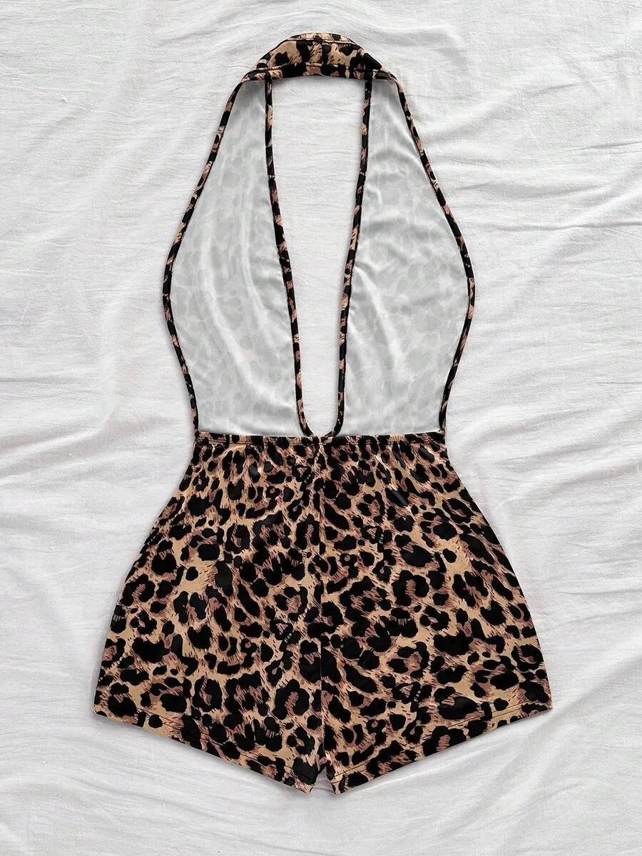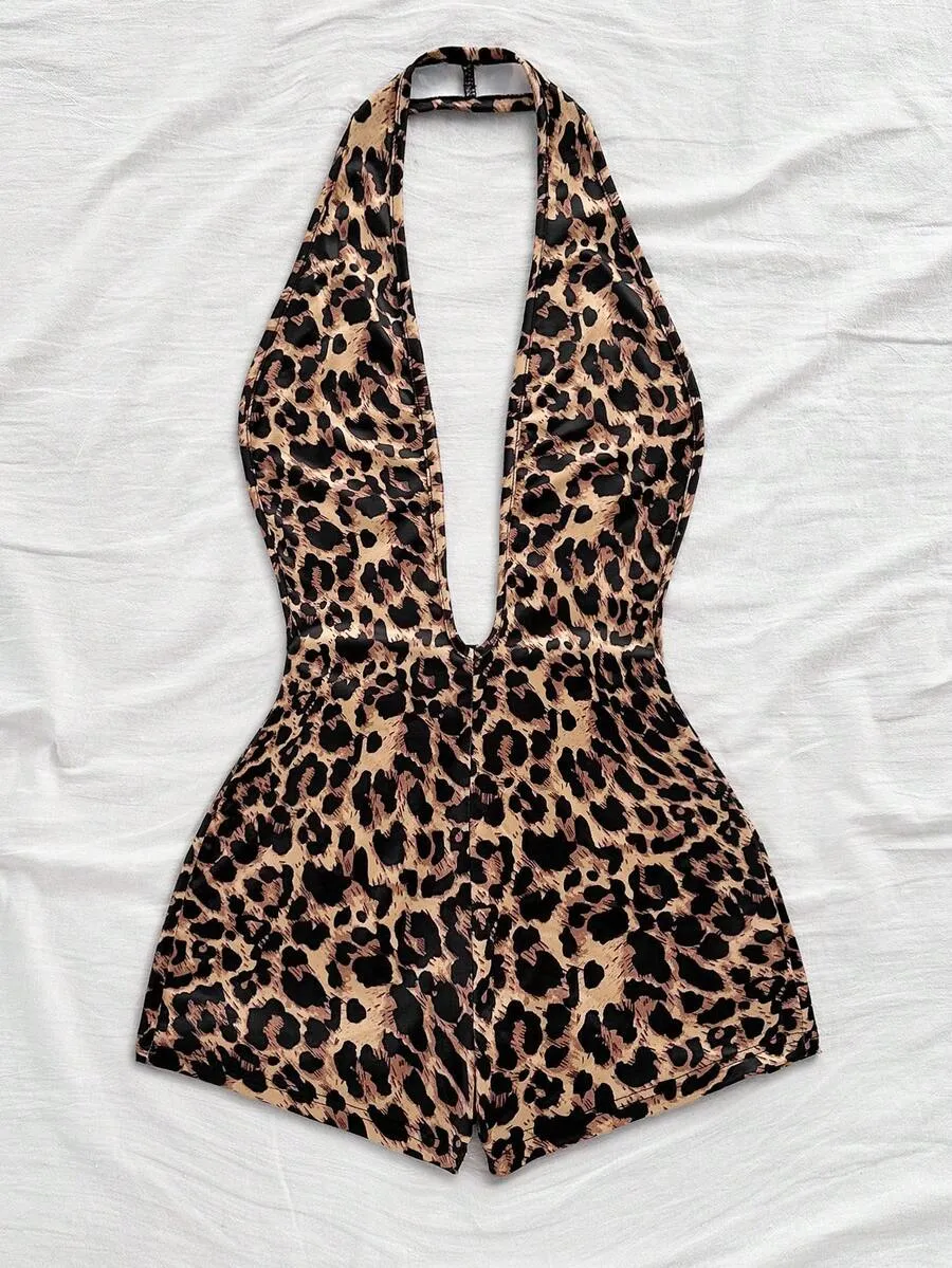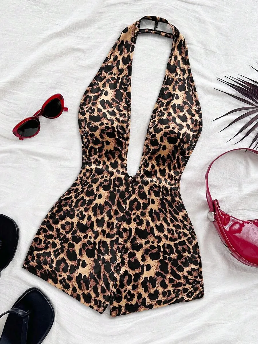 Soleia Women’s Leopard Print Deep V Backless Romper – Party & Vacation