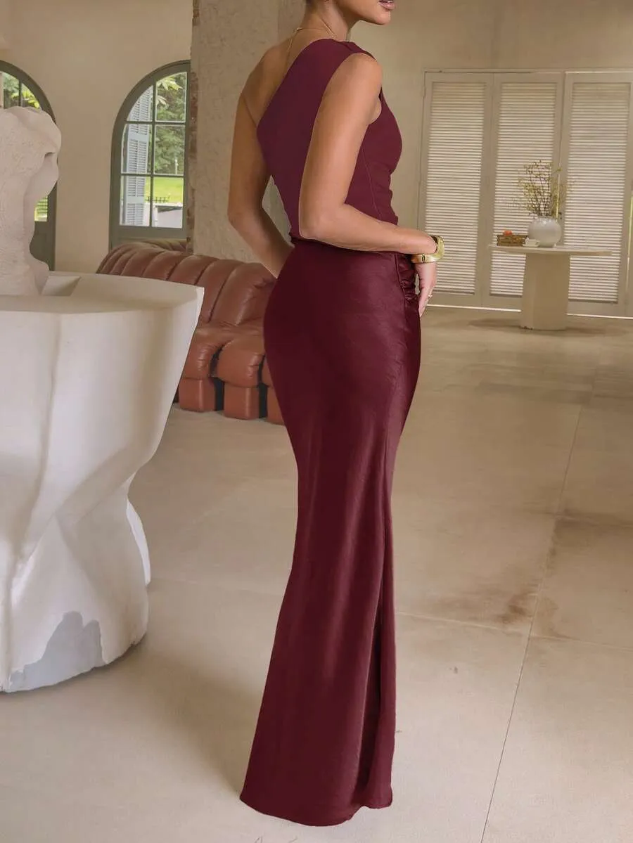 Women’s Mocha Satin Pleated Backless Maxi Dress – Elegant Party & Cocktail Wear